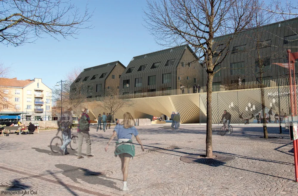 Förslaget leker med de befintliga byggnadernas utformning och taksnitt i den digitala åldern. Vad händer med sadeltaksformen nar den inverteras, snedställs eller vands upp och ned?