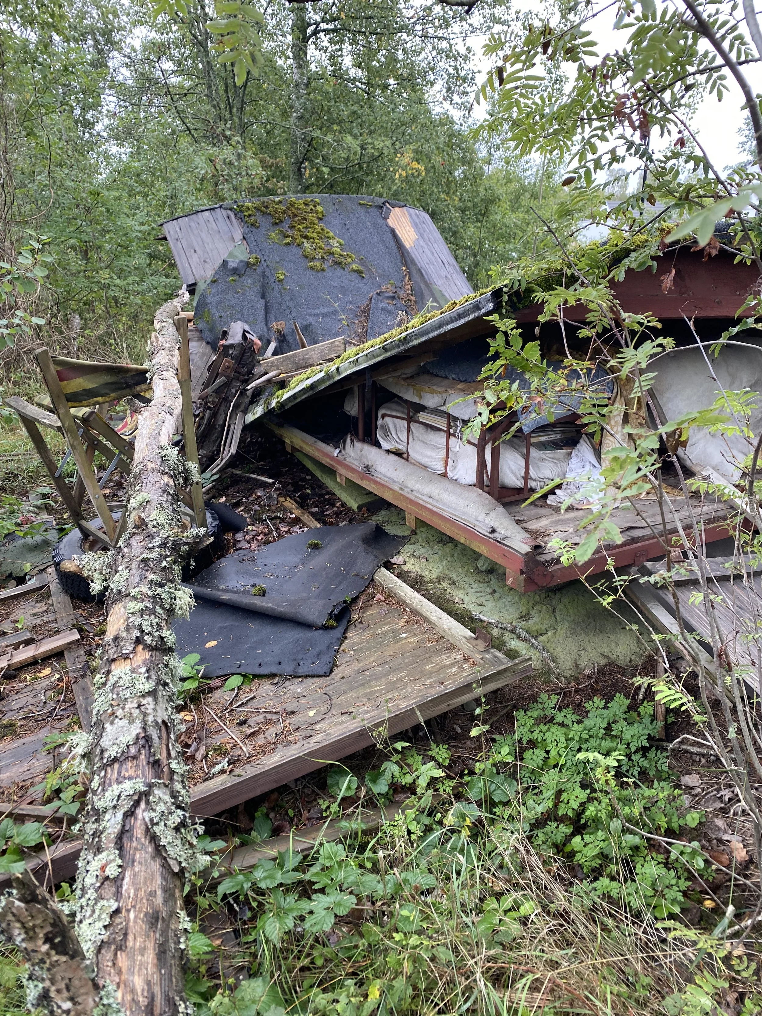 He didn't talk about his story. My grandfather died in his sleep in 2012, not long before my dad died in a car accident, and I inherit a shed in the forest in Huddinge south of Stockholm. 13 years later, in 2025, I pay it a visit. The house has collapsed and the plot of land that used to be in the forest is now surrounded by encroaching suburban sprawl.